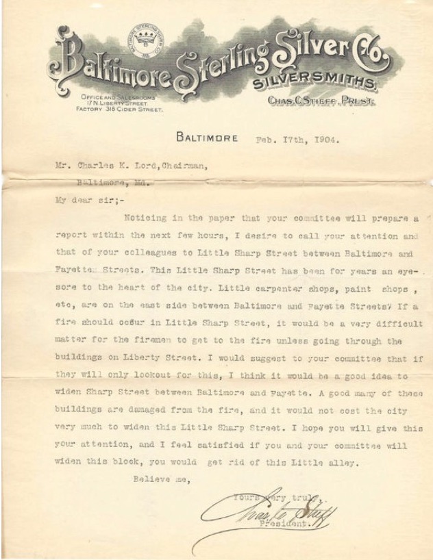 On February 17th 1904, Charles C. Stieff wrote a letter to the committee that was planning the rebuilding of Baltimore after the great fire. Below is that letter.