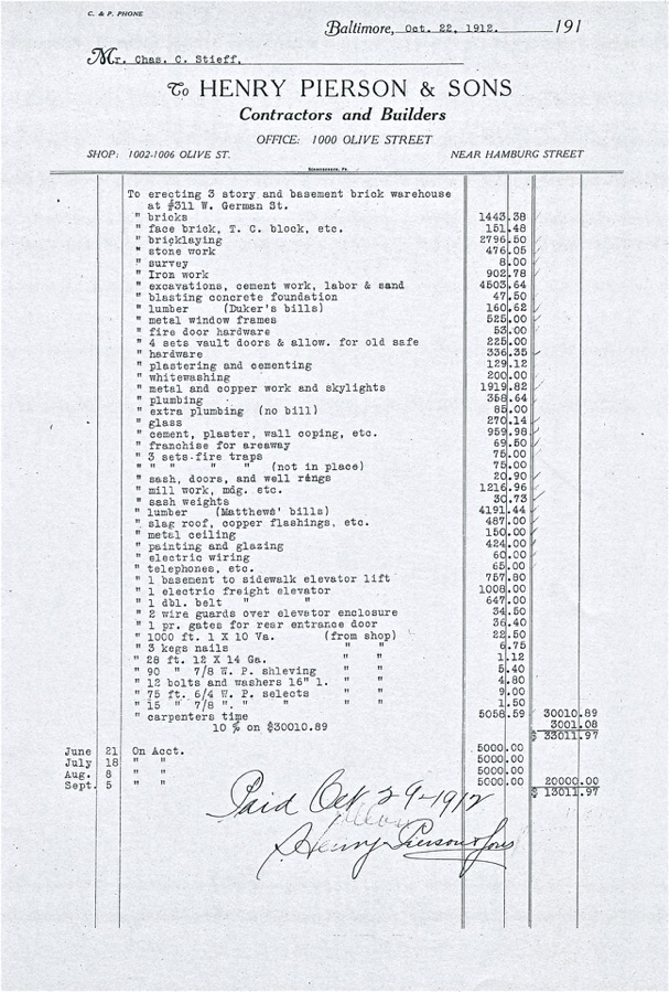 This is the actual 1912 invoice from the contractor to construct the new Stieff Building at 311 Redwood Street. This would move the factory from the cramped old quarters on Cider Alley to a new “state of the art” silversmith facility. Ten short years later they would be breaking ground on the final and most famous Stieff Building on Wyman Driveway.
