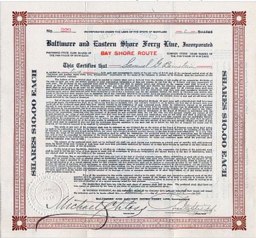Below, Baltimore and Eastern Shore Ferry Line Stock Certificates