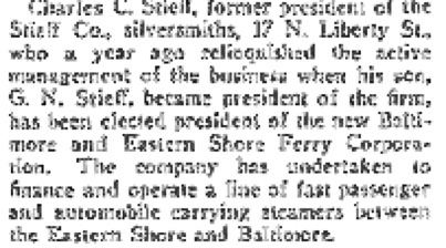 In an interesting side note, when Charles C. Stieff died in 1923, he did not own any stock in the ferry line of which he had been President. Reason unknown.