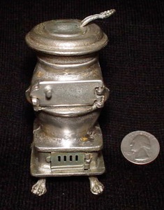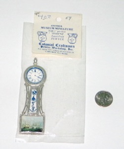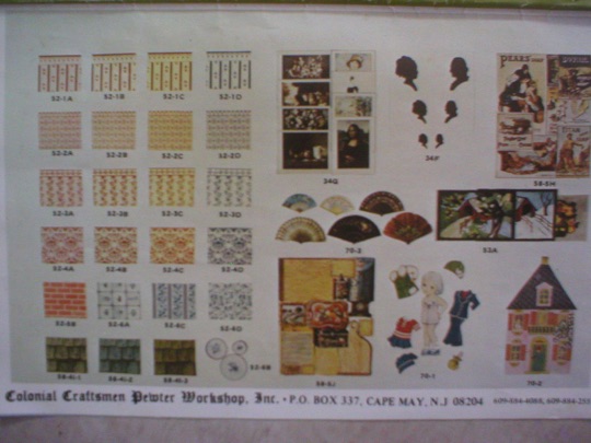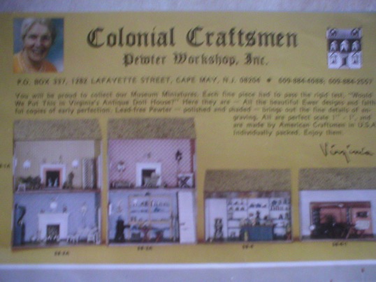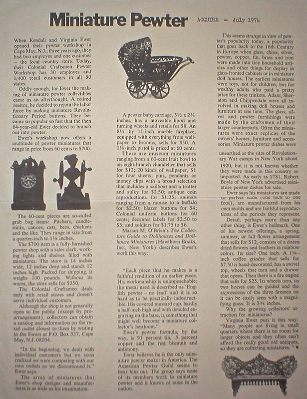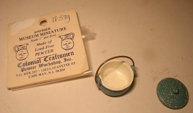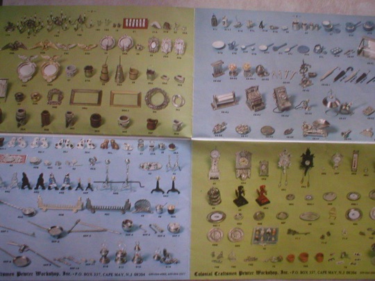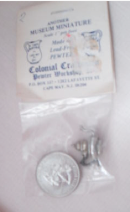 In the early 1970s, Larry Thompson worked summers for Colonial Craftsmen in Cape May. He did the assembly of the pieces. His mother Eleanor worked in sales, shipping and the office. His father Larry made the original model pieces and molds for the miniature pieces... using a hot rubber mold press. Larry says “Molten pewter was pored into the mold and spun to eliminate air bubbles. My father created many of the original models by looking at old Sears catalogs and seeing what they were selling during the time period he was copying. He would look at the pictures and then carve or mold the object in the epoxy. I am not sure how Ken made his models”