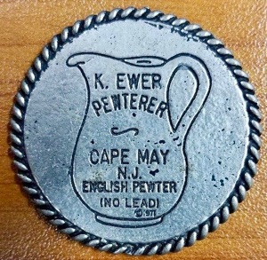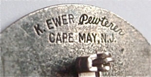 Back of button is imprinted, K. Ewer Pewterer Cape May NJ