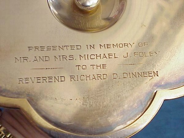 In 1936, Stieff was commissioned to create a Communion Chalice for the Rev. Richard D. Dinneen in memory of