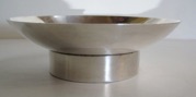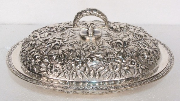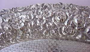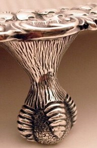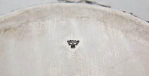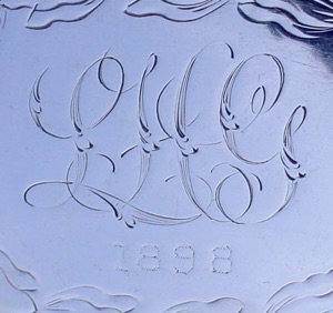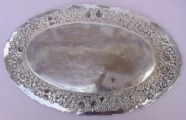This tray has a heavy floral repoussé border round a finely cross-hatched base with a floral encircled cartouche containing a very decorative scrolling monogram. The tray is supported by 4 very nice ball-and-claw feet. An inscription on the back reads April 16 1900. B.S.S.Co., a Crown with a B, 925/Sterling/1000, and #120. Dimensions: 12" diameter. Weight is 24 Troy oz. Ten years later, the 1910 catalog does not contain a #120 tray.