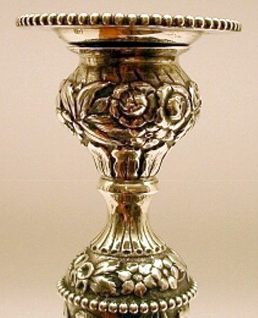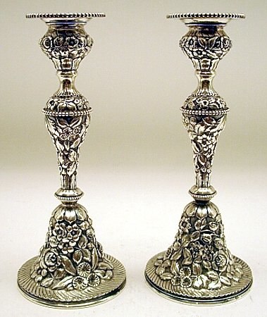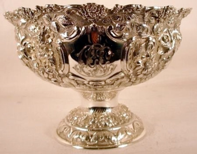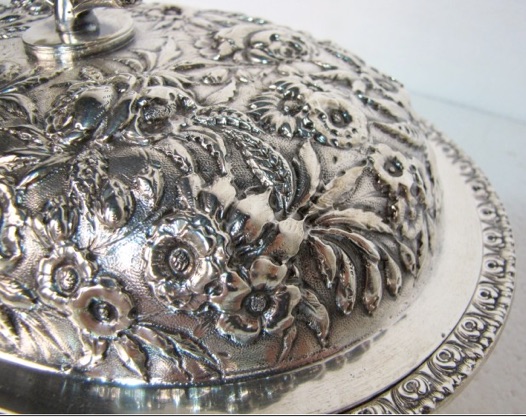 This is a magnificent sterling bowl with all-over high-relief floral repoussé decoration with an applied floral rim. The workmanship is outstanding and the condition is pristine. All detail down to the texture of the petals and the veins in the leaves have been preserved. Large scroll decorated cartouche Marked 256. Dimensions: 7.5" high, 10.25" diameter. Weight 39 Troy oz.