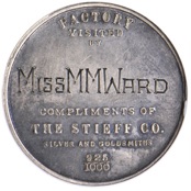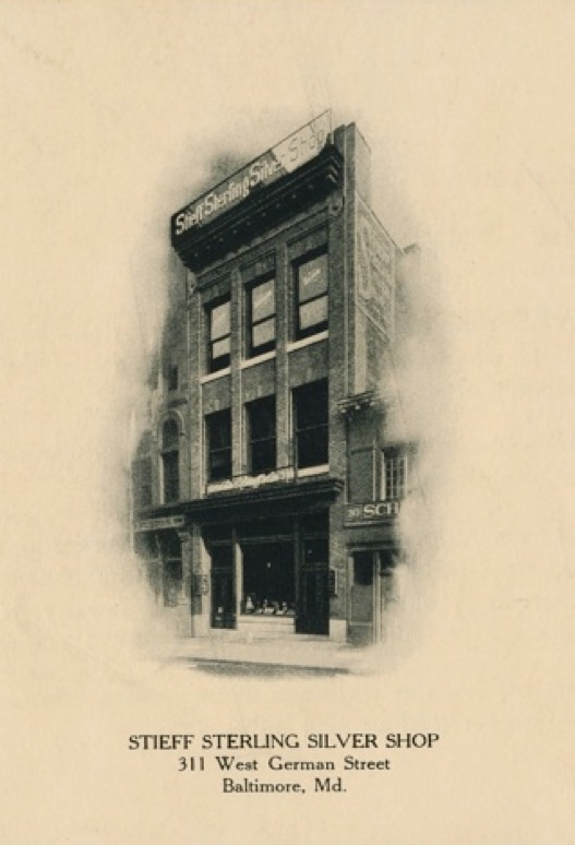 Personal conjecture here. Note the large, bold use of CAPITOLS in the word manufacturing. Charles C. Stieff had been a “jobber” aka middleman in the silver and cutlery business. I think he has the MANUFACTURING stressed in the sign to show that they were producing goods, not just reselling wares from another producer.