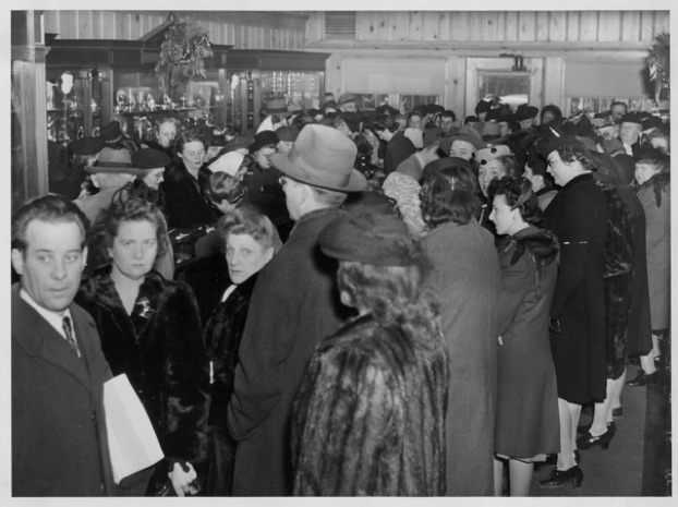 Period dress appears to be 1940s. The abundance of fur coats makes us