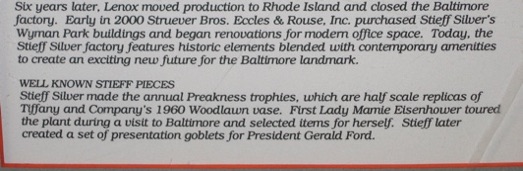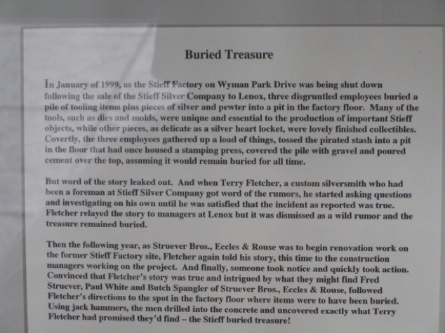 When the Stieff building was being abandoned by Lenox, some employees buried some of the silver in the floor. This treasure was unearthed later during reconstruction.
