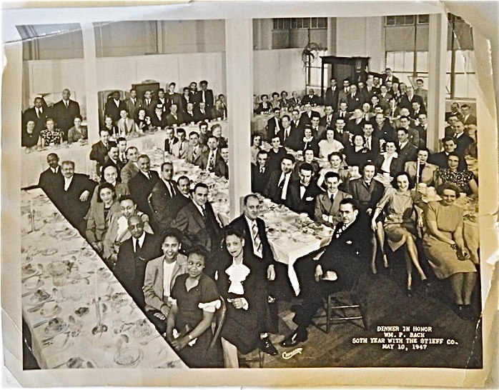 The Stieff Company provided lunch for the workers in the factory. The photo below, taken in the employee dining room was a special occasion. This was the 50th Anniversary party for Stieff Silversmith William P. Bach