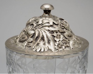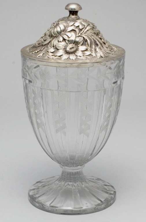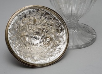 1918 Stieff lid with a Heisey Pressed Glass Candy Jar
