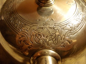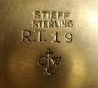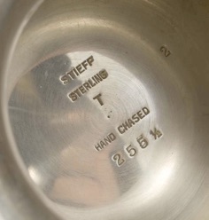 This is an example of an early example of Stieff’s work for Colonial Williamsburg. The CW mark received an oval border in 1950 so this dated from about 1945-1950.