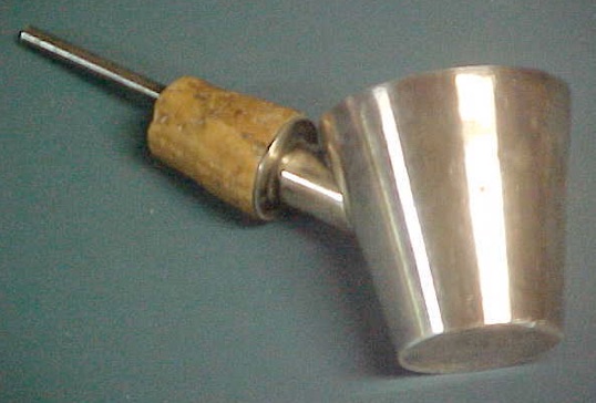 The jigger part is fairly thin and bends easily when dropped or a bottle knocked over. Also, as you hold the jigger to pull the cork out of the bottle.. the jigger will bend. You have to grasp that little neck ... not the jigger. Because of this not many have survived. The marking on these is under the cork of the flange and in the exact spot where the pourer is added to the side of the jigger. Because of this location, it is often very hard to find the words STIEFF or Sterling. Normally only parts of the words appear. These were not made very long and do not appear in price lists or the catalog. These are certainly fun, but not very practical, esp. if you are on your 2nd or 3rd drink of the evening.