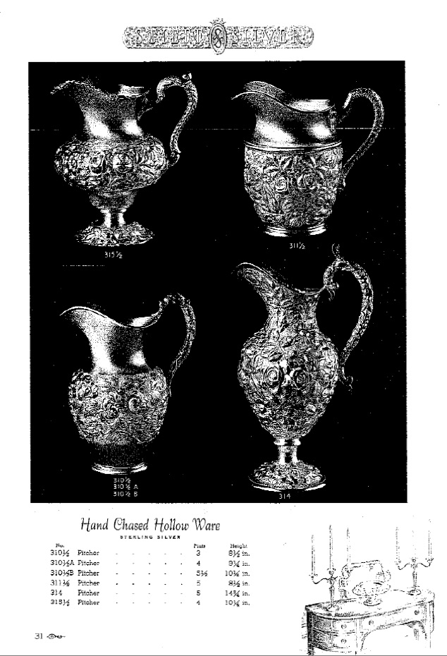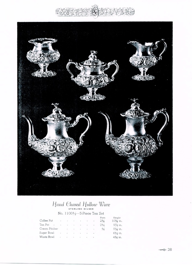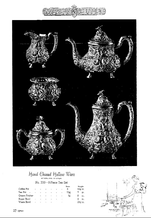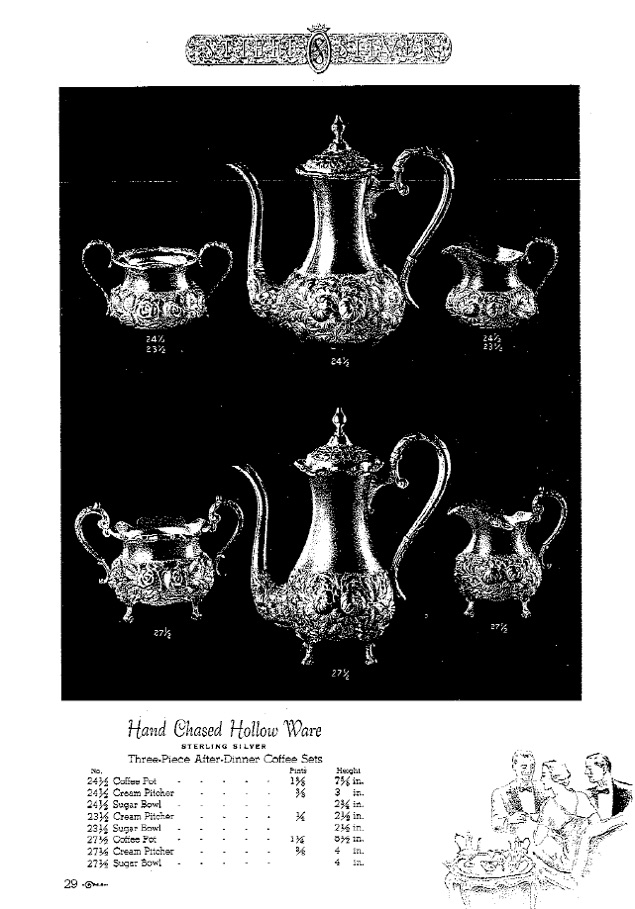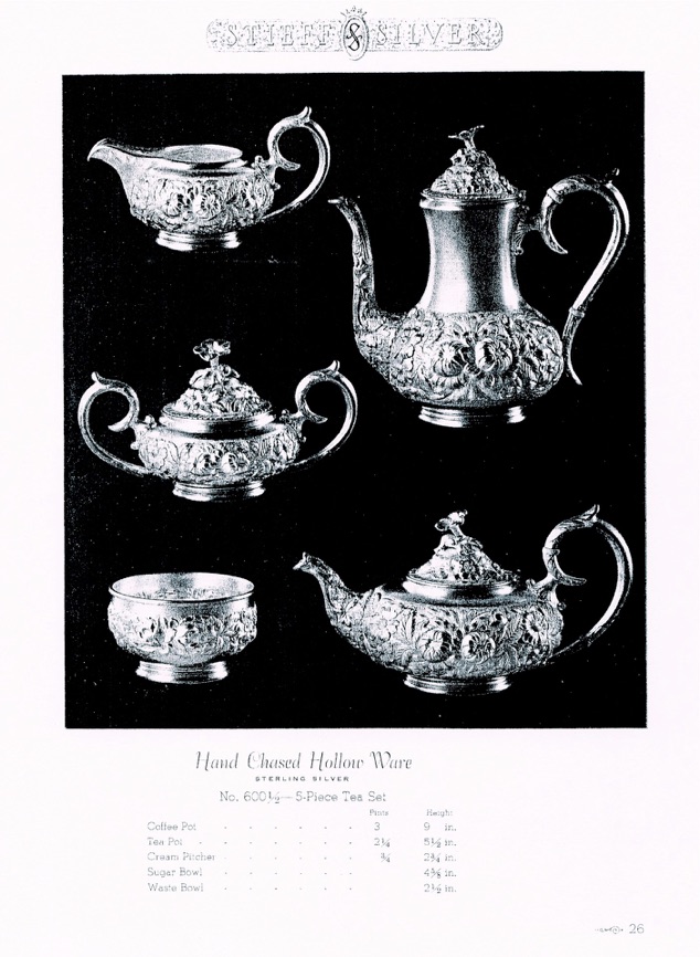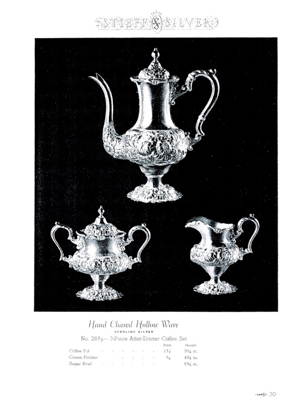 The older styles left over from the Victorian period that were in the late 1920‘s catalog have disappeared in 1937. These pieces could still be made on special order as Stieff still had Master Silversmiths in house.