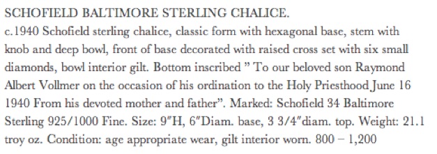 Here are examples of several Chalices made by Schofield in the 1930’s and 1940s. Note that each is similar, but different from the rest of the works. Notations are made where information is available. If you have information on other pieces of church silver made by Schofield, please contact me.