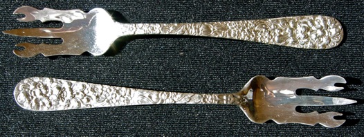 A Wisconsin company has a very good silversmith that takes spoons and makes “lobster picks” out of them. Look at the outside tines of these pieces and you can see the little lobster claws made into the silver. They make a variety of “specialty” items, and are available on their site.