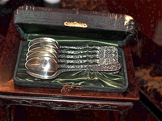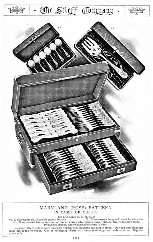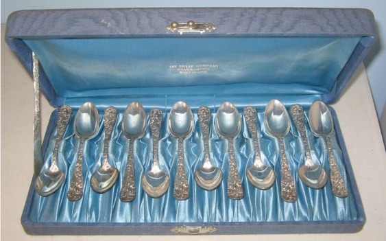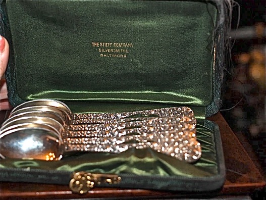 In the early days Stieff silver sold silver in beautiful Moire silk-covered cases. Example of these cases are shown in