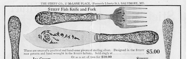 This 1914 Stieff promotional piece shows the fish sets in Rose.