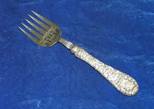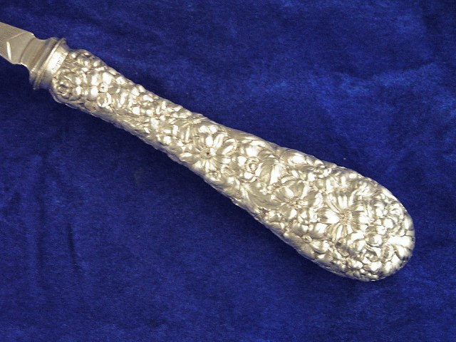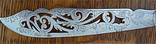 Early in it’s history, Stieff used English Carbon Steel Blades and Utensils on some items. This was not uncommon at the time as England had massive steel works cranking out all sorts of fancy victorian era pieces.