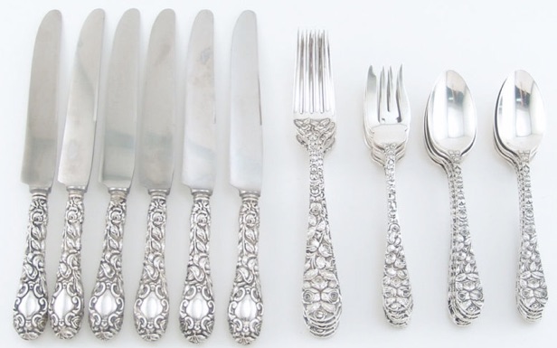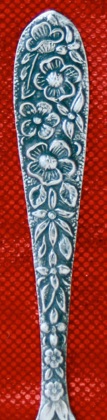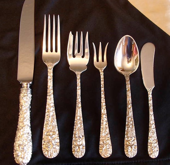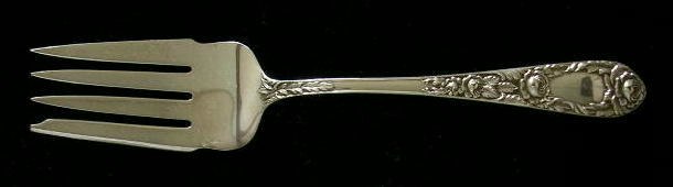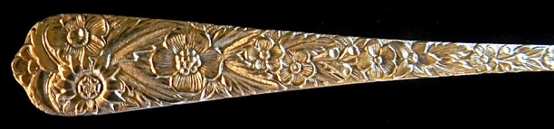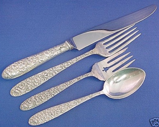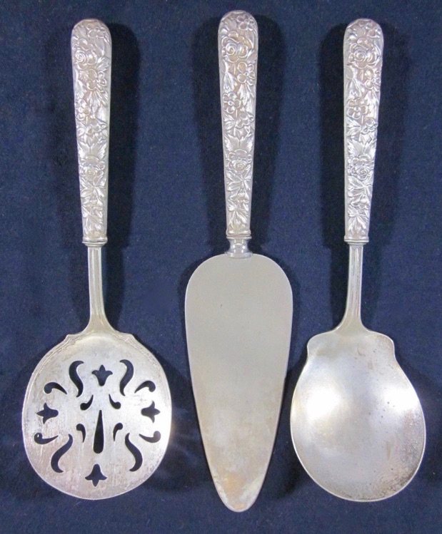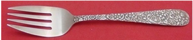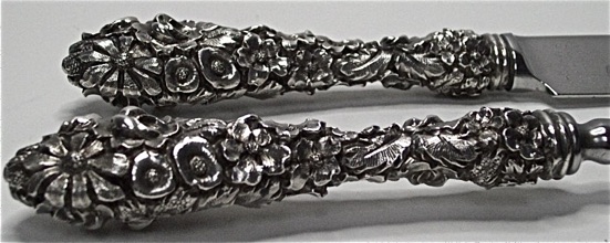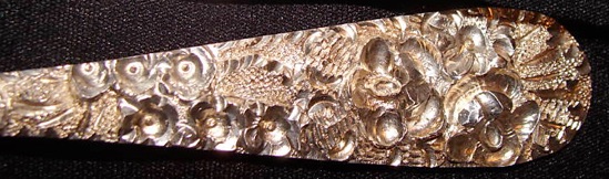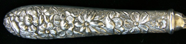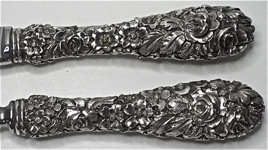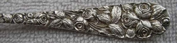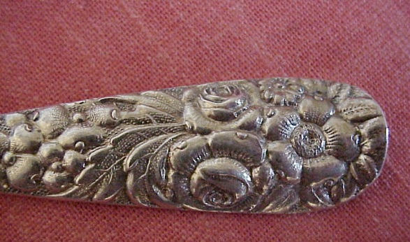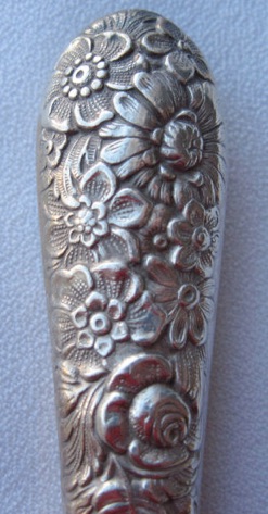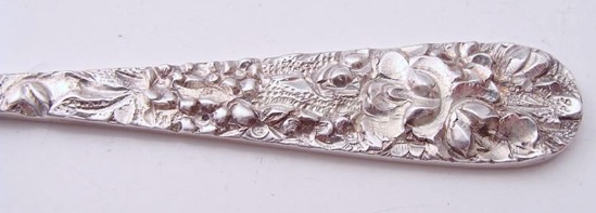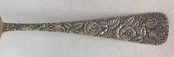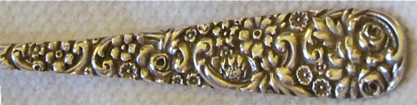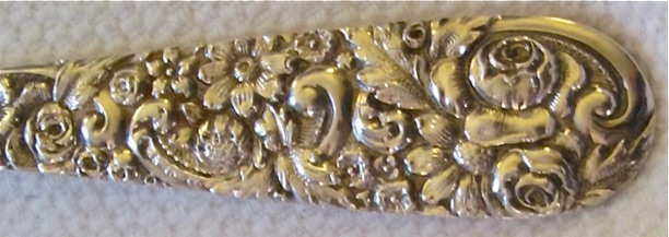 This ”Repoussé”pattern from G H French & Co. has open work on the side of the handle and the pattern does not envelope the entire handle. Very similar to the Southern Rose pattern of Manchester Silver Co. More often confused with the famous S. Kirk & Son pattern Repoussé.