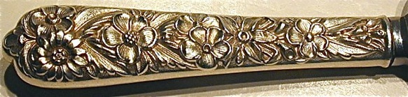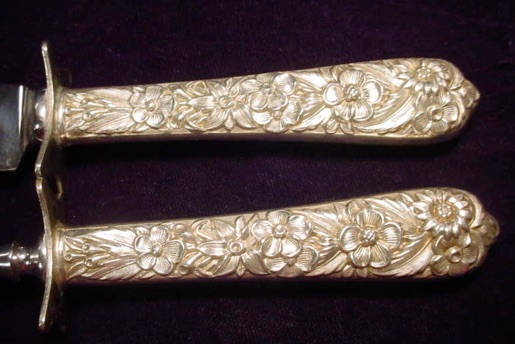 The Knife handles are not hand chased. There is not a center rose like on Stieff Rose, and the pattern is a lot thinner, less dense and the relief of the flowers is much lower.