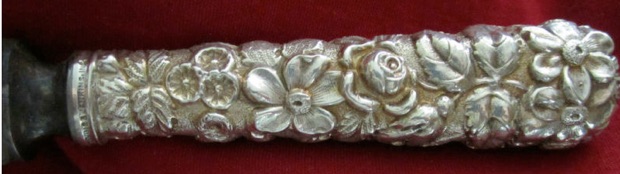The pattern originated in 1846 (not 1828, that was the HOLLOW WARE of the same name) Notice that later versions of the KIRK pattern morphed from the daisy/chrysanthemum into the large central rose. These later pieces really confuse a lot of people as they think it is either KIRK ROSE (see below) or that they have the pattern Stieff Rose. Also, most KIRK knives are NOT hand chased on the sides. Some older round handle versions are fully chased.